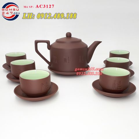 Bộ ấm chén tử sa dáng tích Phúc Lộc Thọ - Xanh chỉ - Đầy đủ phụ kiện