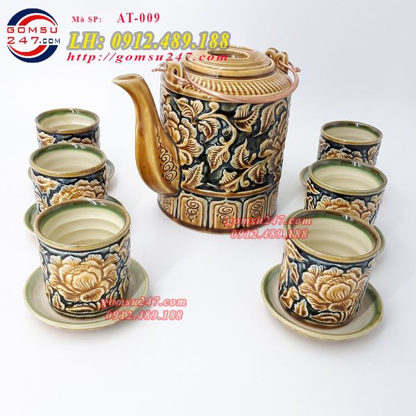 Ấm chén khắc nổi hoa văn, ấm tích khắc nổi thủ công.