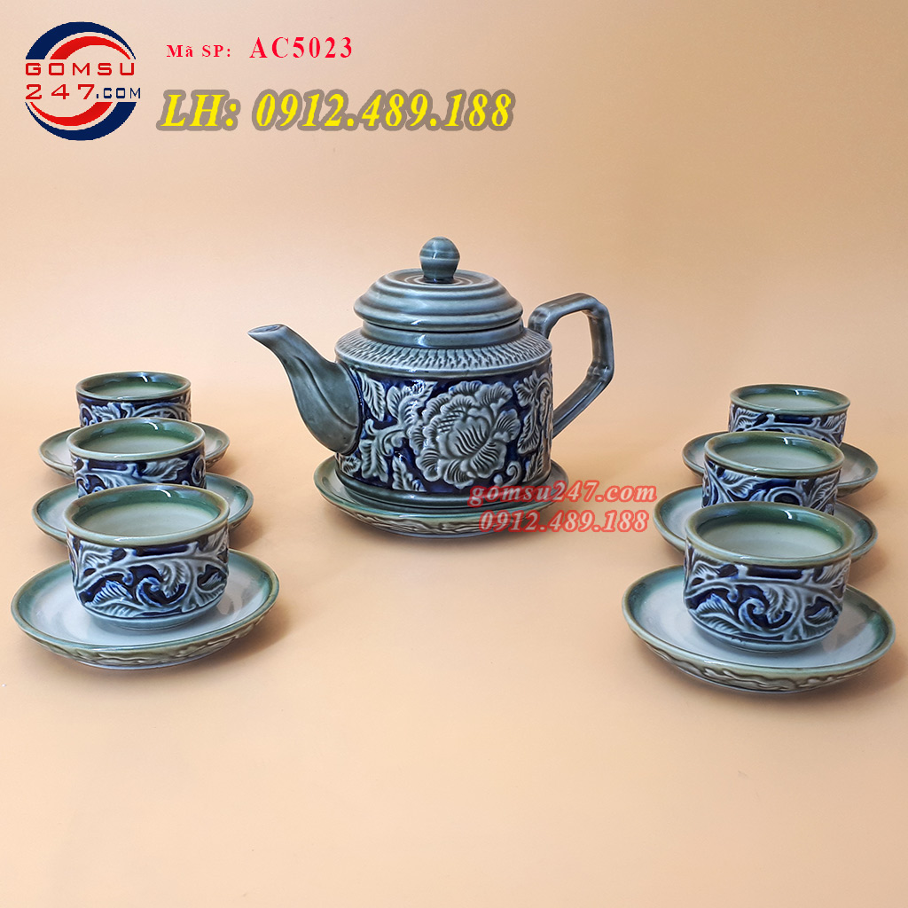 Mẫu ấm chén với hoa văn cổ được khắc nổi thủ công hoàn toàn, dưới bàn tay tay hoa của người thợ gốm Bát Tràng, những nét vẽ trang nhã, tinh tế, đem đến cho người sử dụng nó sự hài lòng.