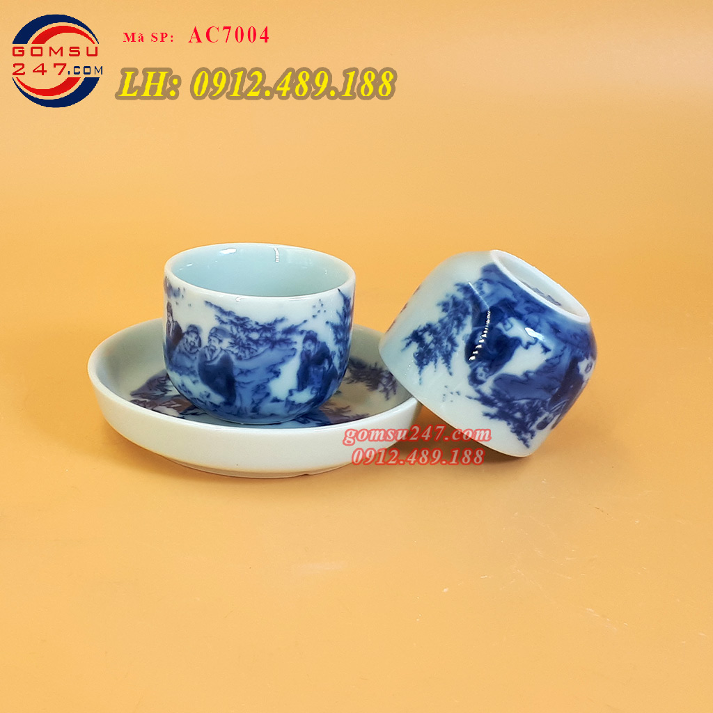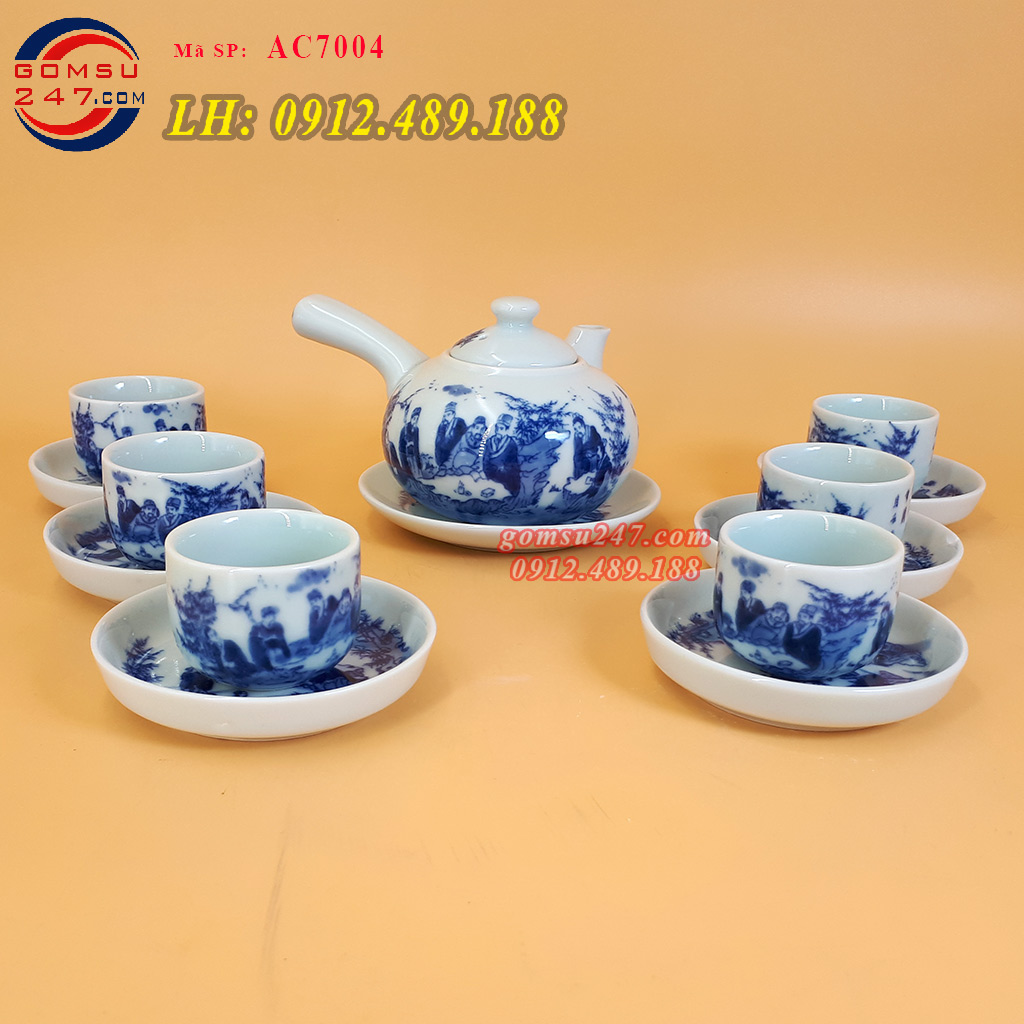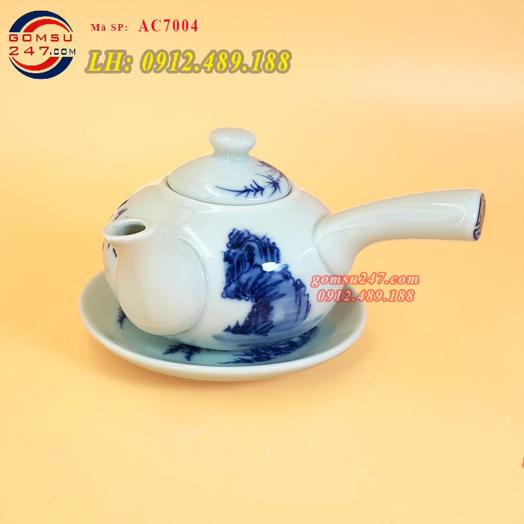 Ấm chén Bát Tràng men lam dáng ấm đào - Vẽ cảnh sơn thủy - Ấm chén gốm, ấm chén sứ Bát Tràng, bộ ấm chén men lam cao cấp, được làm thủ công tạy làng gốm truyền thống Bát Tràng.
