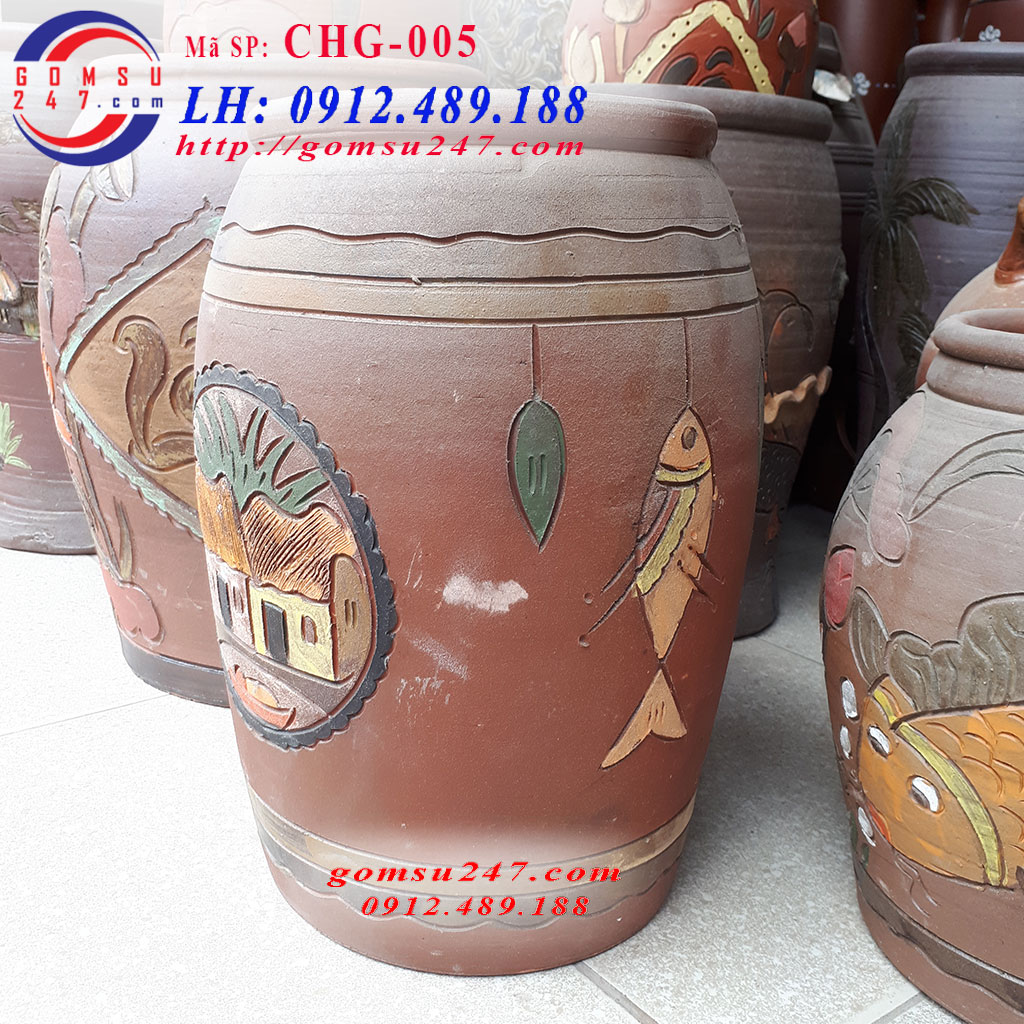 Chum gốm Bát Tràng - Chum gốm trang trí sân vườn, chum gốm trồng cây, chum gốm phong thủy, hàng vuốt tay, cảnh vẽ mộc mạc.