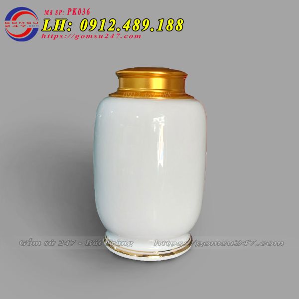 Hộp chè (hộp đựng trà) gốm sứ Bát Tràng cao cấp, men sứ trắng nung khử, kẻ chỉ mạ vàng sang trọng. Đặc biệt, nắp hộp chè bằng đồng, 2 lớp, vặn ren siêu khít, đảm bảo.