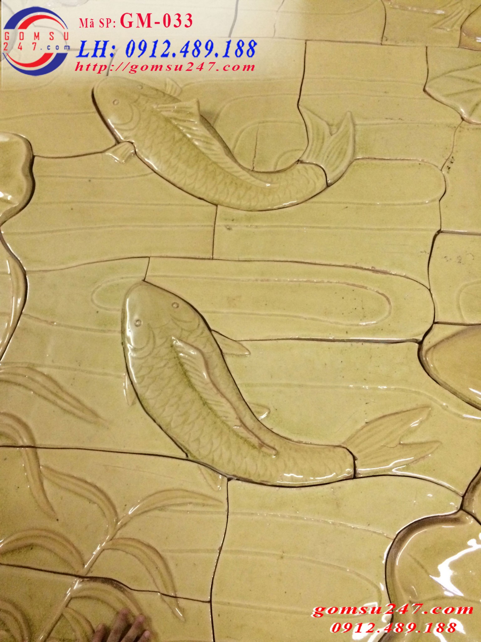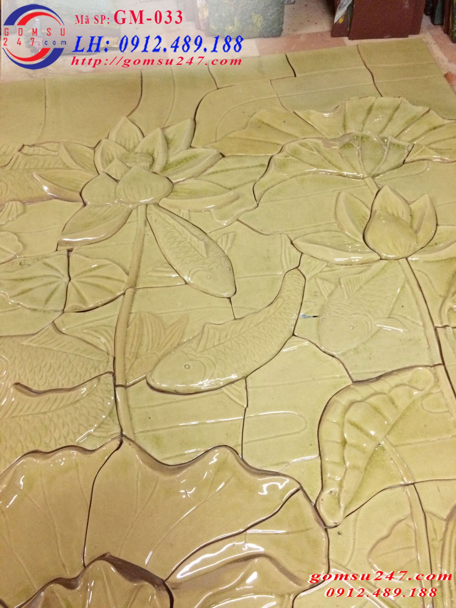 Tranh gốm ốp tường cảnh sen cá - Tranh gốm mộc